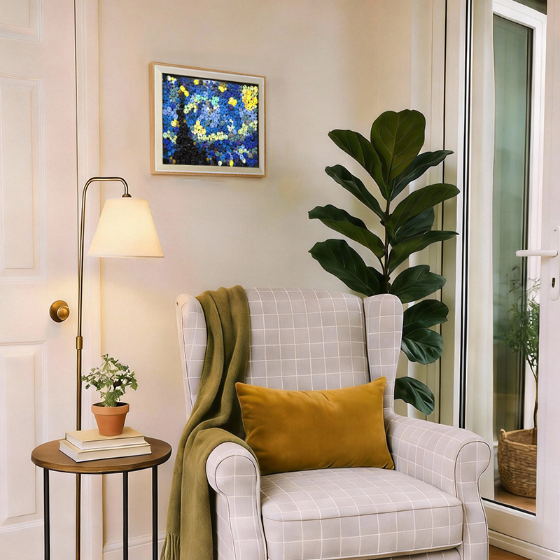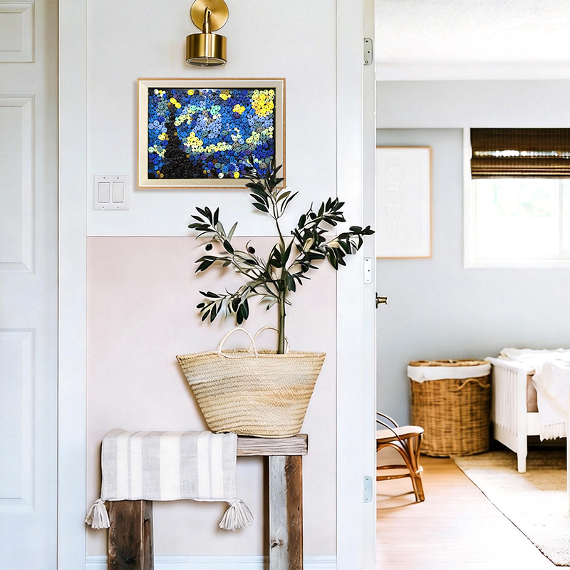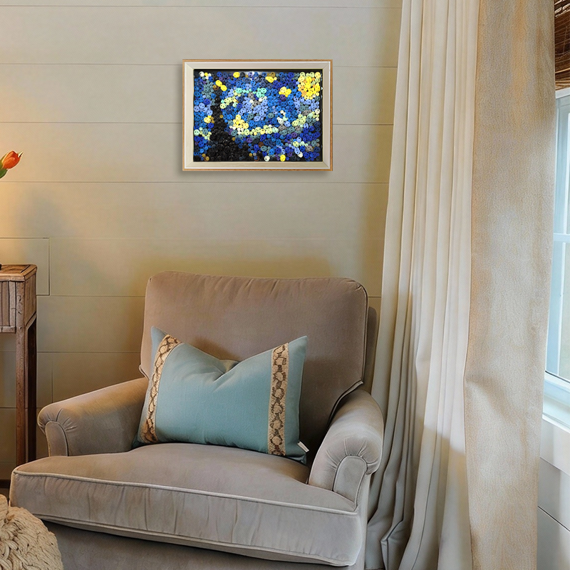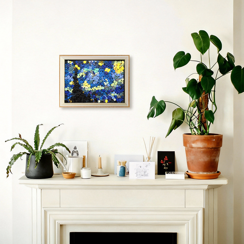 Unlike traditional canvas prints of famous paintings, button artwork introduces a tactile dimension to art. The layered buttons create a subtle mosaic surface that interacts with light and shadow, giving the artwork depth and movement. As natural light changes throughout the day, the buttons reflect different tones, allowing the starry sky to feel dynamic and alive.